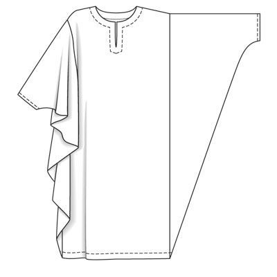 Аккуратно прикрепив бумагу по краю к ткани при помощи невидимок, обвести выкройку мелом или мылом. - Отложить припуски по 1,5−2 см (кроме места складки). После этого можно вырезать деталь. Сметать и прострочить плечевые и боковые швы, припуски обработать на оверлоке или вручную и заутюжить.