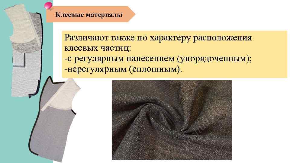 Также различают три вида основы, на которую наносят клей: тканная, нетканная и трикотажная. Тканная основа имеет долевую нить, которую необходимо учитывать при раскрое деталей. Эти виды прокладки еще называют термотканью. Нетканная основа – это прессованная смесь волокон, которая не имеет долевого направления. Дублирующие полотна на трикотажной основе используются для проклеивания изделий из трикотажа, чтобы сохранить эластичность материалов и в то же время придать им форму.