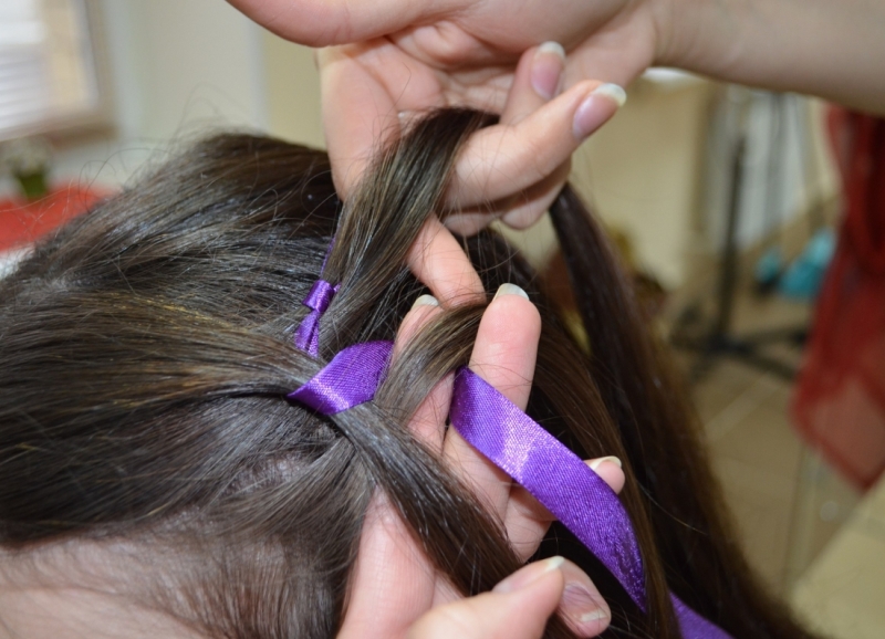 - Теперь плетите косу обычным способом, захватывая и свои, и искусственные локоны и следя за тем, чтобы место фиксации было скрыто волосами.