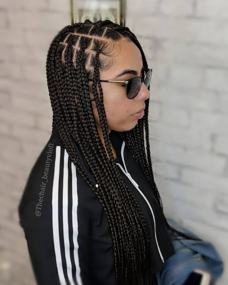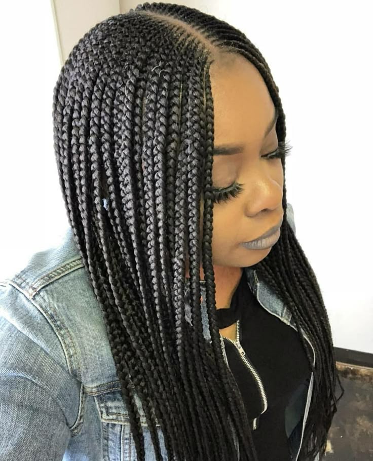 Правила просты. Начните с небольшой пряди волос и добавьте дополнительные волосы по вашему выбору. Стилист по косам Женева Фаулер предлагает следовать той же технике, что и при создании коробчатых кос, без единого пробора. Как только вы начнете плести косу, вы продолжите заплетать ее по всей длине волос.