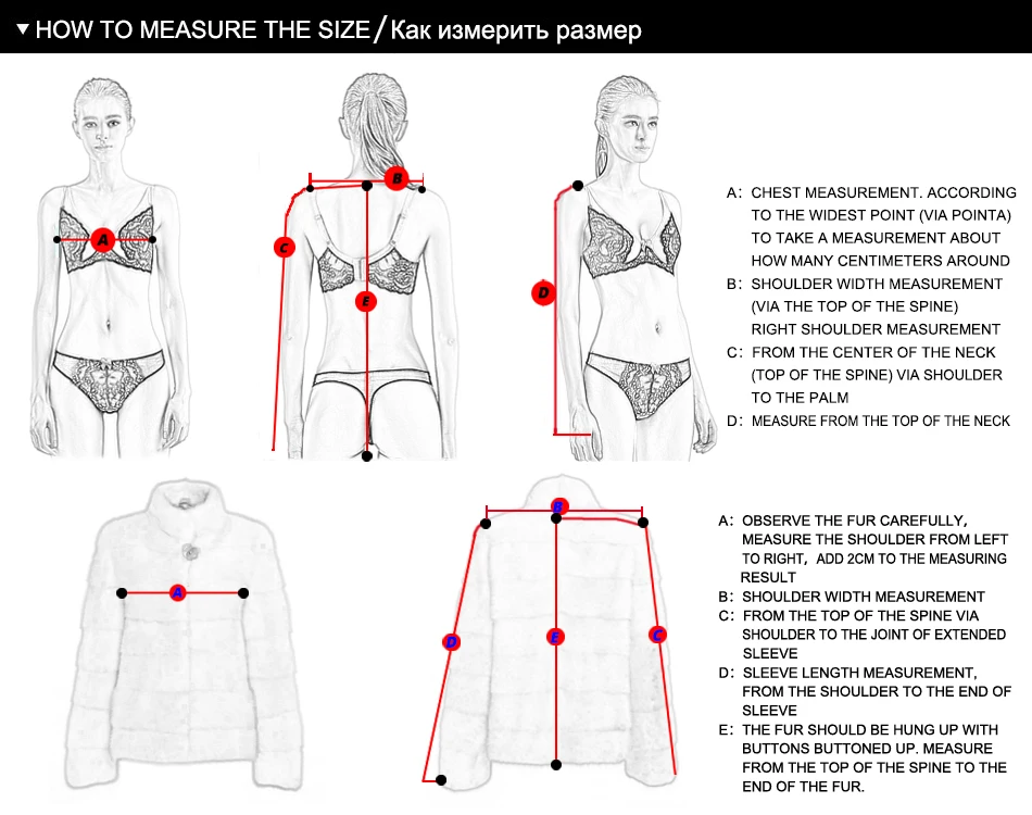 Округлите все измерения до ближайшего размера ½ дюйма или 1,27 см и убедитесь, что рулетка плотно прилегает, но не натягивается. Пожалуйста, не надевайте бюстгальтер во время измерения.