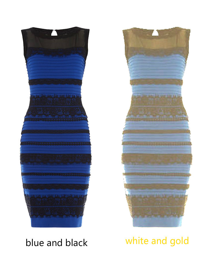 Помните, что платье на самом деле сине-черное, хотя большинство людей видели его бело-золотым, по крайней мере, сначала. Мое исследование показало, что если вы предположили, что платье находится в тени, вы с большей вероятностью увидите его бело-золотым. Почему? Потому что тени преобладают над синим светом. Мысленное вычитание коротковолнового света (который будет казаться голубоватым) из изображения сделает его желтоватым. Естественный свет имеет аналогичный эффект — люди, которые думали, что он освещен естественным светом, также с большей вероятностью видели его бело-золотым. Почему? Поскольку небо голубое, дневной свет также преобладает над короткими волнами по сравнению с относительно длинноволновым искусственным (до недавнего времени обычно лампами накаливания) светом. Точно так же, как мысленное вычитание синего света делает изображение более желтым, мысленное вычитание желтого света из изображения делает изображение более голубым, что я и обнаружил эмпирическим путем.