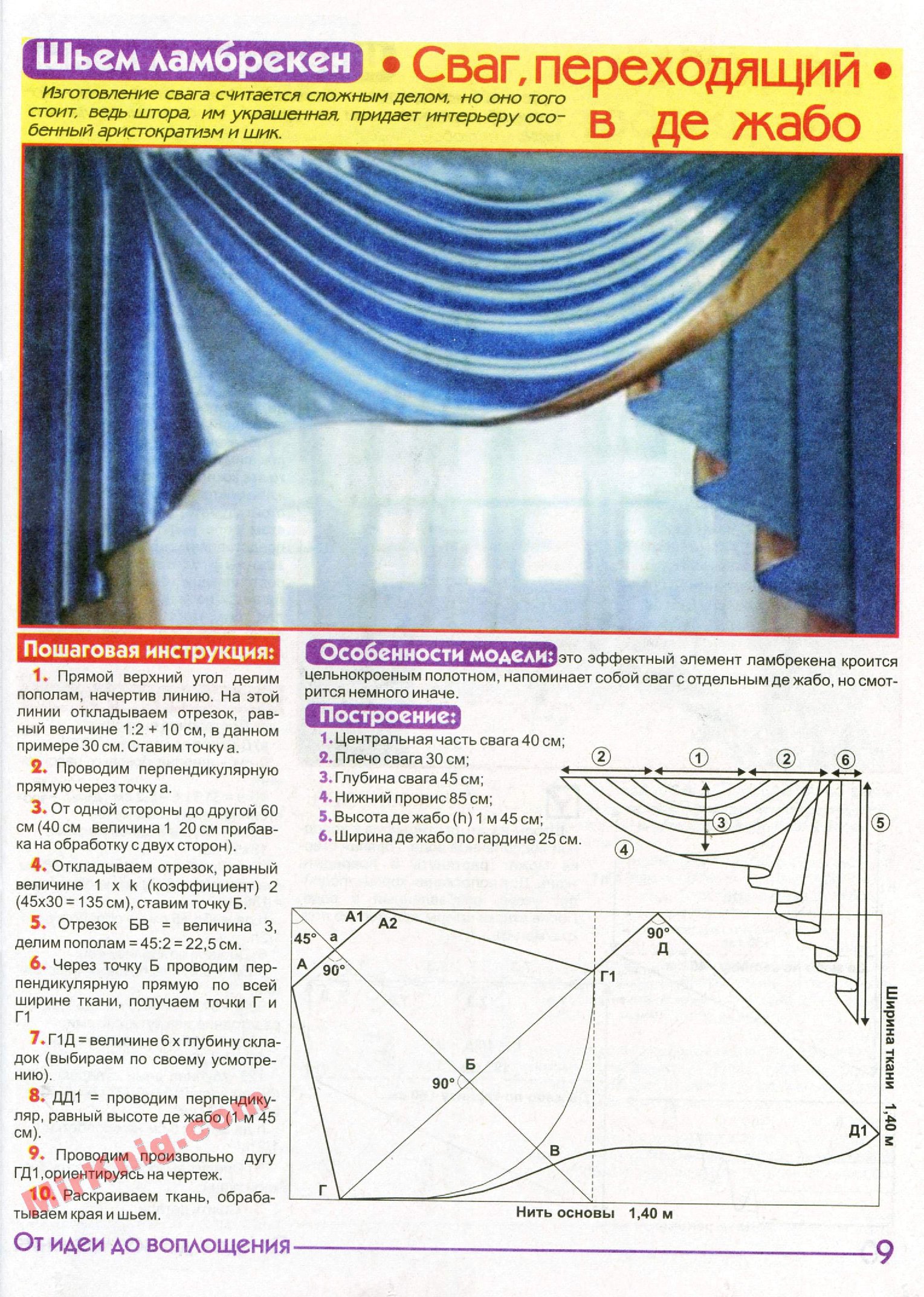 Чтобы правильно выкроить ткань для ламбрекена-сваг, воспользуйтесь нашей картинкой-выкройкой. Также можно учесть то, что выкройки могут иметь форму трапеции, что по высоте должны быть выше чем готовое изделие в 1,5 раза. Чтобы правильно рассчитать ширину, ее составляют из длины сторон трапеции и ее верхней части.