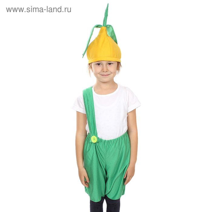 Данный костюм лука для мальчика представляет собой шорты желтого цвета с зеленой одной шлейкой на большой декоративной пуговице. На голове у ребенка надета конусная шляпа с украшением на верхушке, в виде перьев зеленого лука. Можно выбрать ткань из искусственного меха, как на фотографии ниже, но не забывайте, что обычно на празднике очень жарко, да еще дети много двигаются. В меховых штанах и шляпе ребенку может быть жарко. Лучшим материалом для изготовления костюма будет фетр или хлопчатобумажная ткань.