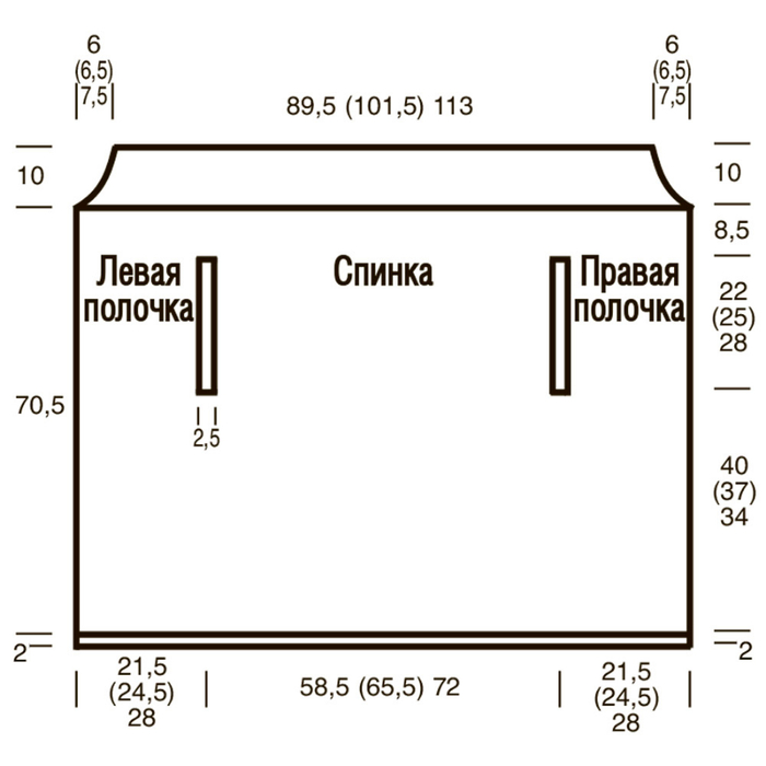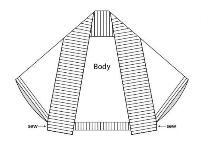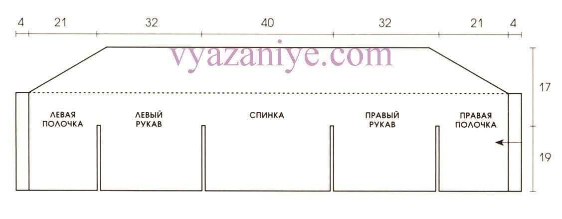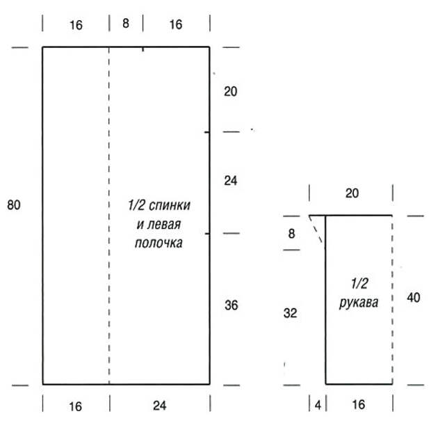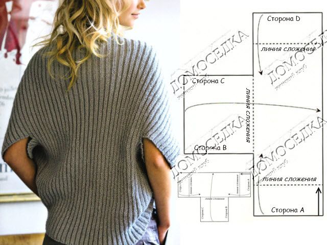 Прямоугольник нужно вязать до тех пор, пока его высота не станет равной запланированной длине изделия (ДИ). На этом этапе работа по схеме прекращается. Деталь нужно пропарить утюгом с паром. Воздействовать на полотно нужно исключительно паром, не ставя на него подошву прибора. Затем прямоугольник складывают вдоль длинной грани и сшивают короткие стороны от открытых краёв к линии сгиба. Незашитой оставляют только часть полотна, длина которого равна половине обхвата рукава (ОР/2).