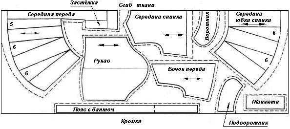 Баска выкраивается ко косой нити, а пояс (полоска ткани) можно кроить как по долевой, так и по поперечной нити.